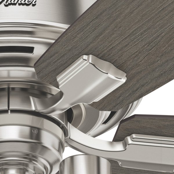 5 Blades - 52" Diameter - 3 Speed - Reversible Motor, Reversible Blades, Quiet - 27" Height x 17" Width - Metal General Information Manufacturer: Hunter Fan Co. Manufacturer Part Number: 54190 Brand Name: Hunter Fan Product Line: Bennett Product Name: Bennett With 3 Lights 52 inch Marketing Information: Regarded as one of our best ceiling fans by designers and homeowners alike, the renewed classic look of a Bennett ceiling fan will add flair to your traditional living spaces. The smoked yet clear multi-light side glass completes this fan's harmonious color palette while adding a touch of glamour. The energy-efficient LED Edison bulbs enhance the ambiance of your room while a powerful WhisperWind motor will make your formal, chic spaces as functional as they are stylish. Rated for indoor use only 3 bulbs included Handheld remote included LIGHT OUTPUT: Provides ambient, warm light. EASY CONTROL FUNCTION: Use the control to adjust the fan speed and dim the light. WHISPER-QUIET MOTOR: 3-speed, WhisperWind reversible motor for optimal performance in summer and winter. LARGE ROOM FAN: Ideal size for spaces like living rooms and bedrooms. STANDARD PROFILE MOUNTING: 3 inch and 2 inch downrods included. COMPATIBLE ACCESSORIES: Works with Hunter and Casablanca accessories, not including Hunter Original accessories WARRANTY: Limited Lifetime Motor Warranty backed by the only company with over 135 years in the fan business Packaged Quantity: 1 Product Type: Ceiling Fan Technical Information Fan Diameter: 52" Number of Blades: 5 Blade Pitch: 13 Maximum Air Flow: 30198.9 gal/min Speed Settings: 3 Reverse Airflow: Yes Style: Casual Mount Type: Angle Mount Mount Type: Standard Mount Mount Type: Ceiling Mount Number of Bulbs Supported: 3 Bulb Type: LED Maximum Bulb Power: 3.50 W Light Fitting Included: Yes Installation Hardware Included: Yes Features: Reversible Blades Features: Quiet Features: Reversible Motor Power Description Input Voltage: 120 V AC Power Consumption: 49 W Physical Characteristics Finishing: Brushed Nickel Fan Blade Finishing: Gray Walnut Fan Blade Finishing: Light Gray Oak Product Material: Metal Height: 27" Width: 17" Length: 10" Weight (Approximate): 27.80 lb Miscellaneous Package Contents: Bennett With 3 Lights 52 inch 5 x Blades Handheld Remote 3 x Bulbs 3'' and 2'' Downrods Application/Usage: Kitchen Application/Usage: Room Application/Usage: Bedroom Application/Usage: Home Application/Usage: Indoor Application/Usage: Living Room ETL Listed: Yes Country of Origin: China Warranty Limited Warranty: Lifetime