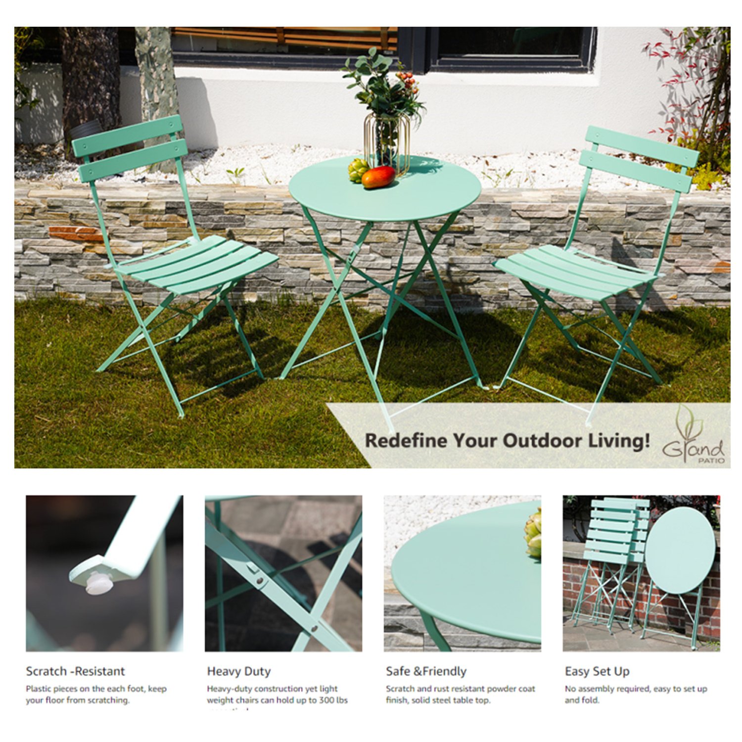 Our Grand Patio Parisian stylish outdoor bistro set includes garden table and chairs; which are outdoor powder coated. Our garden furniture sets are concise; beautiful and sturdy. These pub table and chairs also has plastic cushions on foot and the joint for protection. This outside furniture is certainly the quality modern outdoor furniture you can't miss.